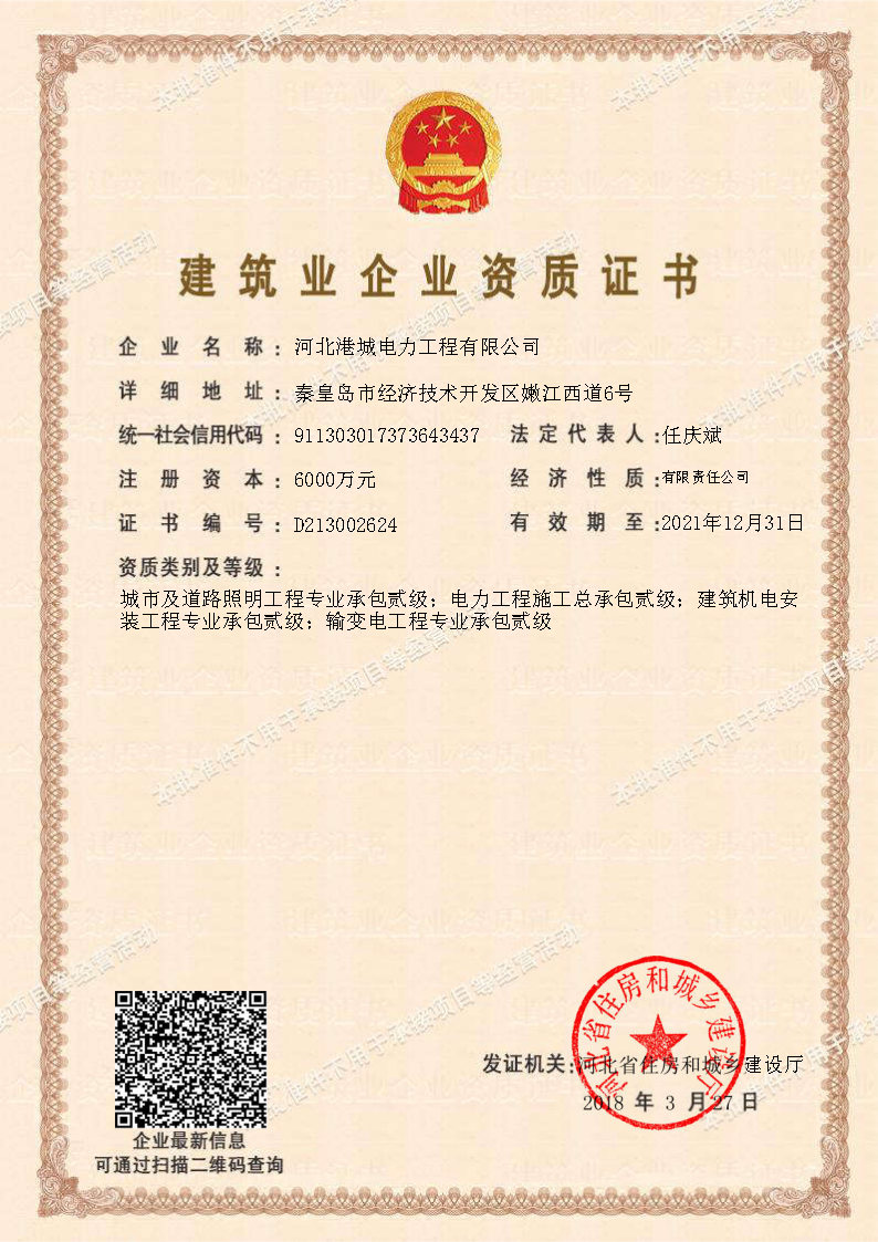公司先后取得了河北省住房和城鄉(xiāng)建設(shè)廳頒發(fā)的《電力工程施工總承包貳級(jí)》資質(zhì)、河北省住房和城鄉(xiāng)建設(shè)廳頒發(fā)的《送變電工程專(zhuān)業(yè)承包貳級(jí)》資質(zhì)、《機(jī)電設(shè)備安裝工程專(zhuān)業(yè)承包貳級(jí)》資質(zhì)、《城市及道路照明工程專(zhuān)業(yè)承包貳級(jí)》資質(zhì)、《電力行業(yè)(送電、變電)專(zhuān)業(yè)設(shè)計(jì)乙級(jí)》資質(zhì)、《電力行業(yè)(送電、變電)專(zhuān)業(yè)勘察乙級(jí)》資質(zhì)和國(guó)家電力監(jiān)管委員會(huì)頒發(fā)的《承裝(修、試)電力設(shè)施許可證》(承裝類(lèi)貳級(jí)、承修類(lèi)貳級(jí)、承試類(lèi)貳級(jí)資質(zhì)),并通過(guò)了國(guó)際認(rèn)可的ISO9001質(zhì)量管理體系、ISO14001環(huán)境管理體系、ISO18001職業(yè)健康安全管理體系三體系的認(rèn)證。公司經(jīng)過(guò)多年的發(fā)展和積累,現(xiàn)已在秦皇島開(kāi)發(fā)區(qū)新區(qū)征地約100畝,投資近億元,計(jì)劃開(kāi)發(fā)建設(shè)高新科技產(chǎn)品生產(chǎn)基地,該項(xiàng)目的開(kāi)發(fā)投入,勢(shì)必將為公司的持續(xù)發(fā)展注入新的動(dòng)力。公司以“責(zé)任為重、誠(chéng)信為本、穩(wěn)健經(jīng)營(yíng)、科學(xué)管理、回報(bào)社會(huì)”為企業(yè)宗旨,本著“誠(chéng)實(shí)守信、精心施工、和諧發(fā)展”的企業(yè)精神,恪守“勤奮經(jīng)營(yíng)、開(kāi)拓創(chuàng)新、共同發(fā)展”的經(jīng)營(yíng)理念,真誠(chéng)服務(wù)每一位客戶(hù),同時(shí)期待與各界朋友的精誠(chéng)合作、共同發(fā)展。